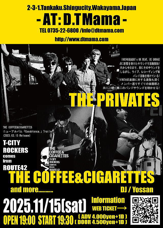 出演 THE PRIVAETS THE COFFEE & CIGARETTES OPEN 19:00 / START 19:30 前売4.000円 / 当日4.500円(別途1DRINK500円) D.TMama チケット予約 *公演名 *お名前(カナでお願いします) *枚数 *連絡先 明記の上送信下さい。