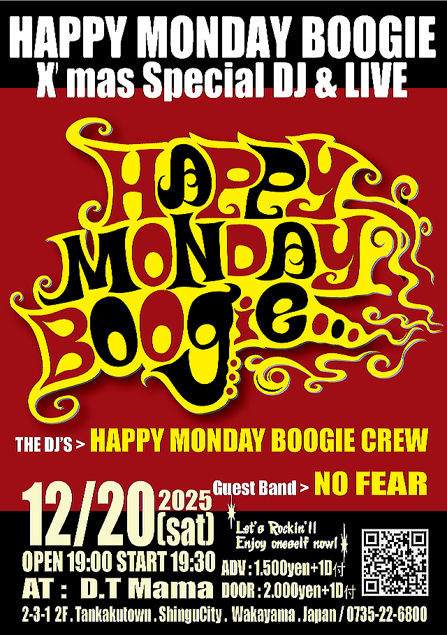 出演 DJ / HAPPY MONDAY CREW Band / NO FEAR OPEN 19:00 / START 19:30 前売 1.500円 / 当日2.000円(1DRINK付) D.TMama チケット予約 *公演名 *お名前(カナでお願いします) *枚数 *連絡先 明記の上送信下さい。