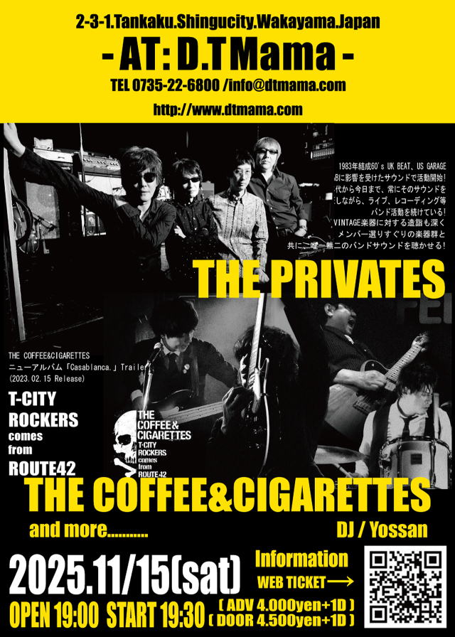 2025 .11/15(sat) 出演 THE PRIVAETS THE COFFEE & CIGARETTES OPEN 19:00 / START 19:30 前売4.000円 / 当日4.500円(別途1DRINK500円) D.TMama チケット予約 *公演名 *お名前(カナでお願いします) *枚数 *連絡先 明記の上送信下さい。 |
